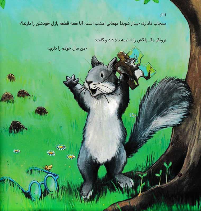 برونکو به سنجاب گفت: «گمان نمیکنم به مهمانی بیایم». اما ته دلش خیلی دوست داشت برود. سنجاب به برونکو گفت: «دستکم تلاش کن قطعه پازلت را پیدا کنی، باید یک جایی همین دوروبرها باشد. تو که نمیخواهی مهمانی را از دست بدهی، مگر نه؟»