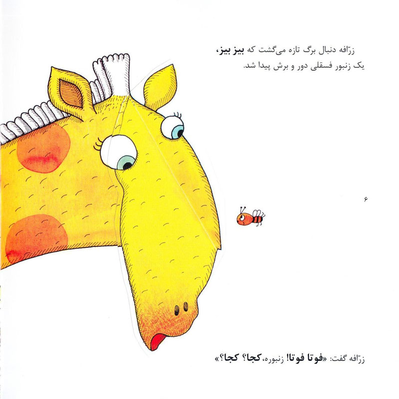 البته این تمام حسن کتاب “زنبوره، کجا؟ کجا؟” نیست. تصویرگری جذاب و بامزهی این اثر یکی دیگر از دلایل موفقیت آن است. برای اینکه بفهمیم آخر سر حیوانات از دست گلهی زنبورها کجا قایم میشوند، باید حتماً کتاب را بخوانیم و بعد پشت بوتههای کاغذی به دنبال شیر و زرافه و جوجه بگردیم!